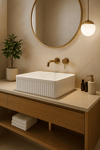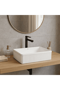 El lavamanos KOF destaca por su forma cuadrada y acabado acanalado, que aporta textura, profundidad y un toque arquitectónico a cualquier baño. Su diseño geométrico, combinado con líneas limpias y proporciones equilibradas, lo convierten en una pieza moderna y sofisticada.